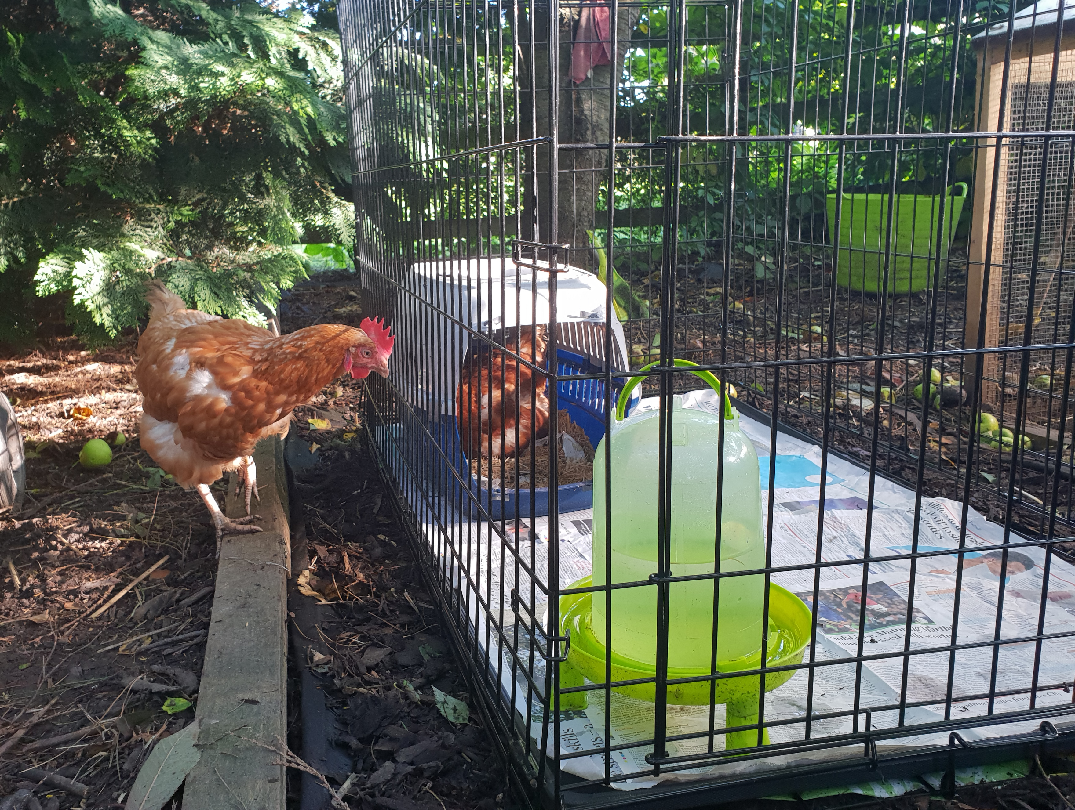 I patiently went and collected her, brought her back to the new run (I even brought up the deluxe boutique individual nesting box up for her – it’s a cat carrier with bedding in it, but they love it).