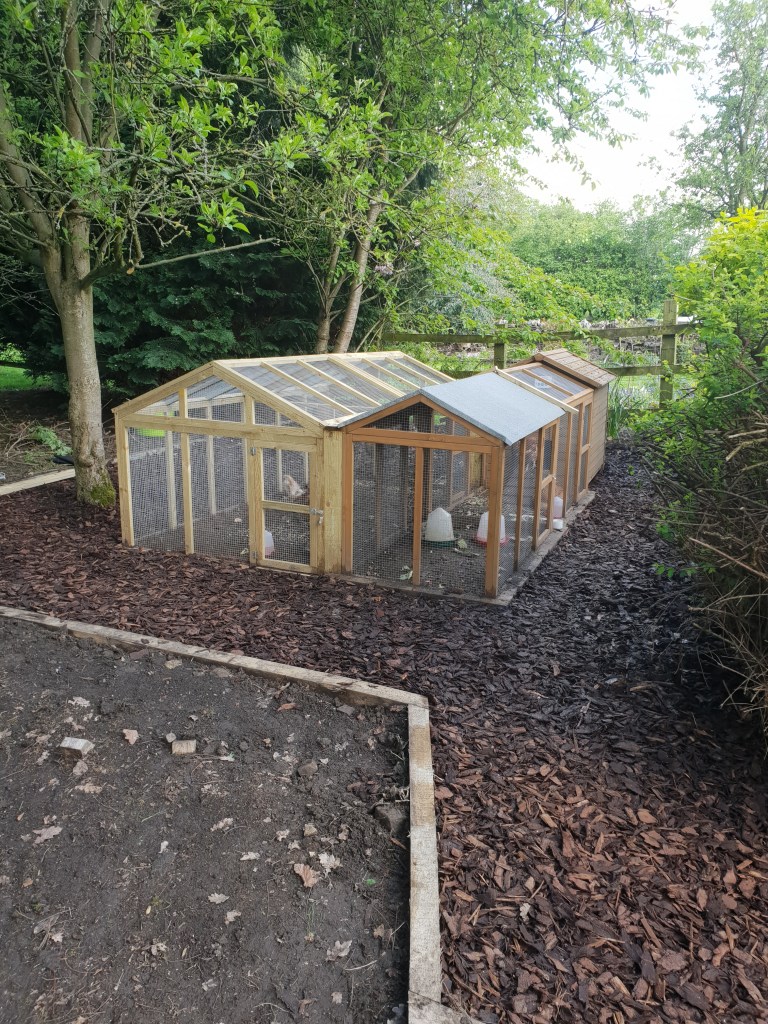 When the coop and run arrives I was horrified by how little space they appeared to have and the fact that half the run had no shelter at all, (this was entirely my fault for not checking the dimensions and assuming that a double sized run would be sufficient). Luckily my husband is handy and spend the first week tripling the size of the run and adding a perspex roof. His handiwork can be seen on the photo below, the left hand side of the run was all his own work.