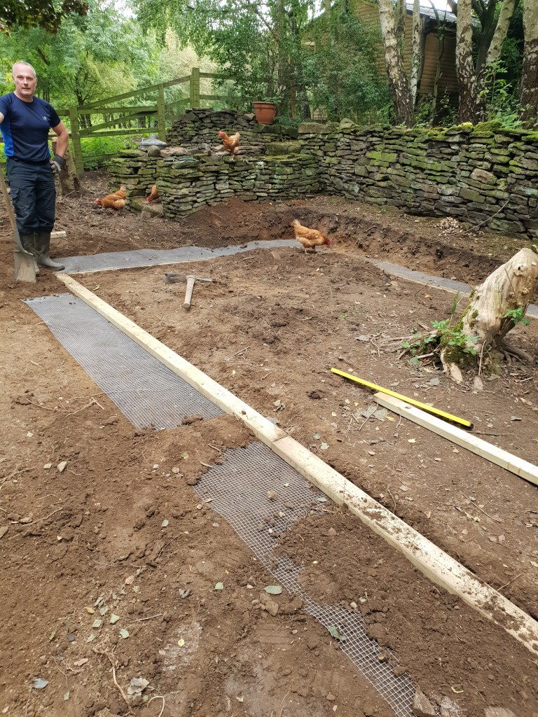 We cleared a space on the land approx. 3m x 10m for the run, a bit further away from the lane. It looked completely flat, but apparently it wasn’t (Creative Husband owns a spirit level). It took 3 days of earth moving to level the area. All good cardio work!