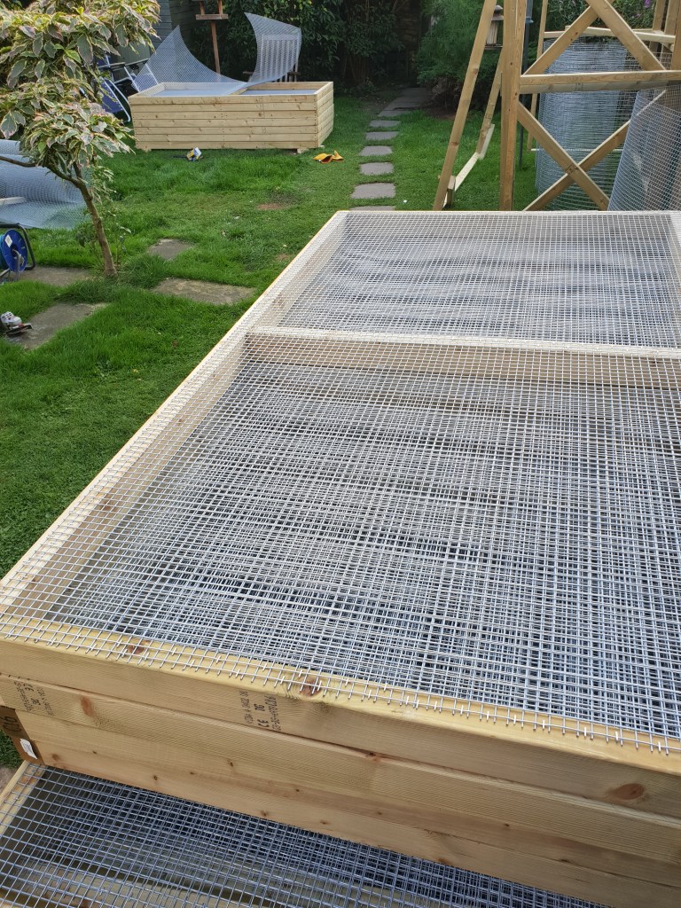 We built the panels for the front sides and back using wood and the same welded mesh stapling the mesh to the frames. For the roof panels we used finer and larger mesh as this will have a corrugated plastic roof over the top of it so doesn’t need to be as secure.