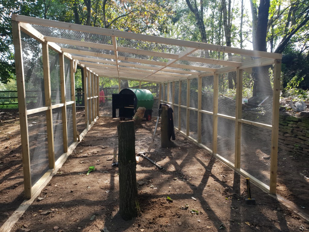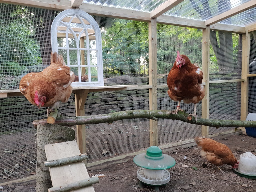 Once the plastic roof panels were attached the real fun started, adding things to keep the girls active and interested. Having watched them play for over a year I knew that tree stumps to jump on are great fun, as is roosting on branches. But I also asked online groups who had some great ideas.